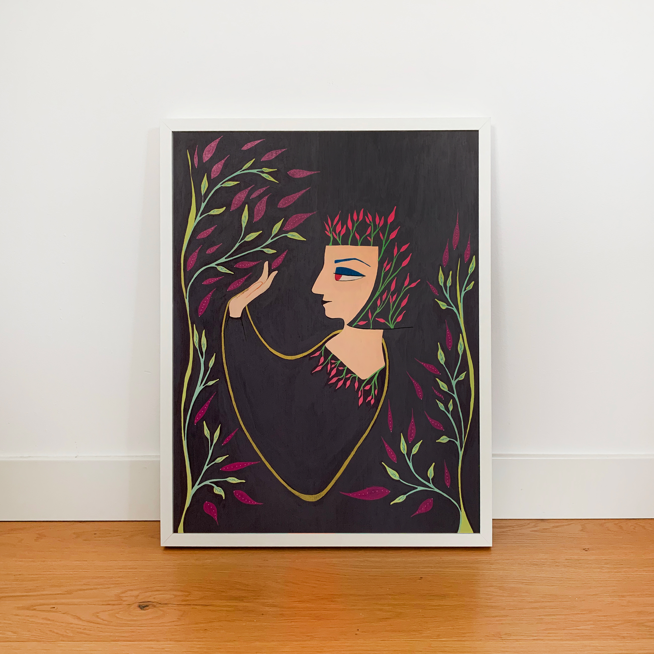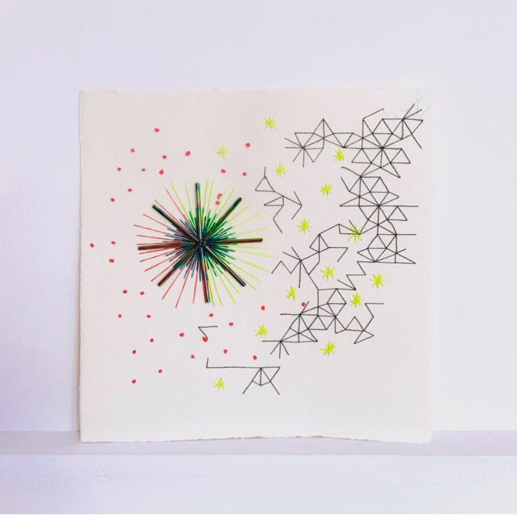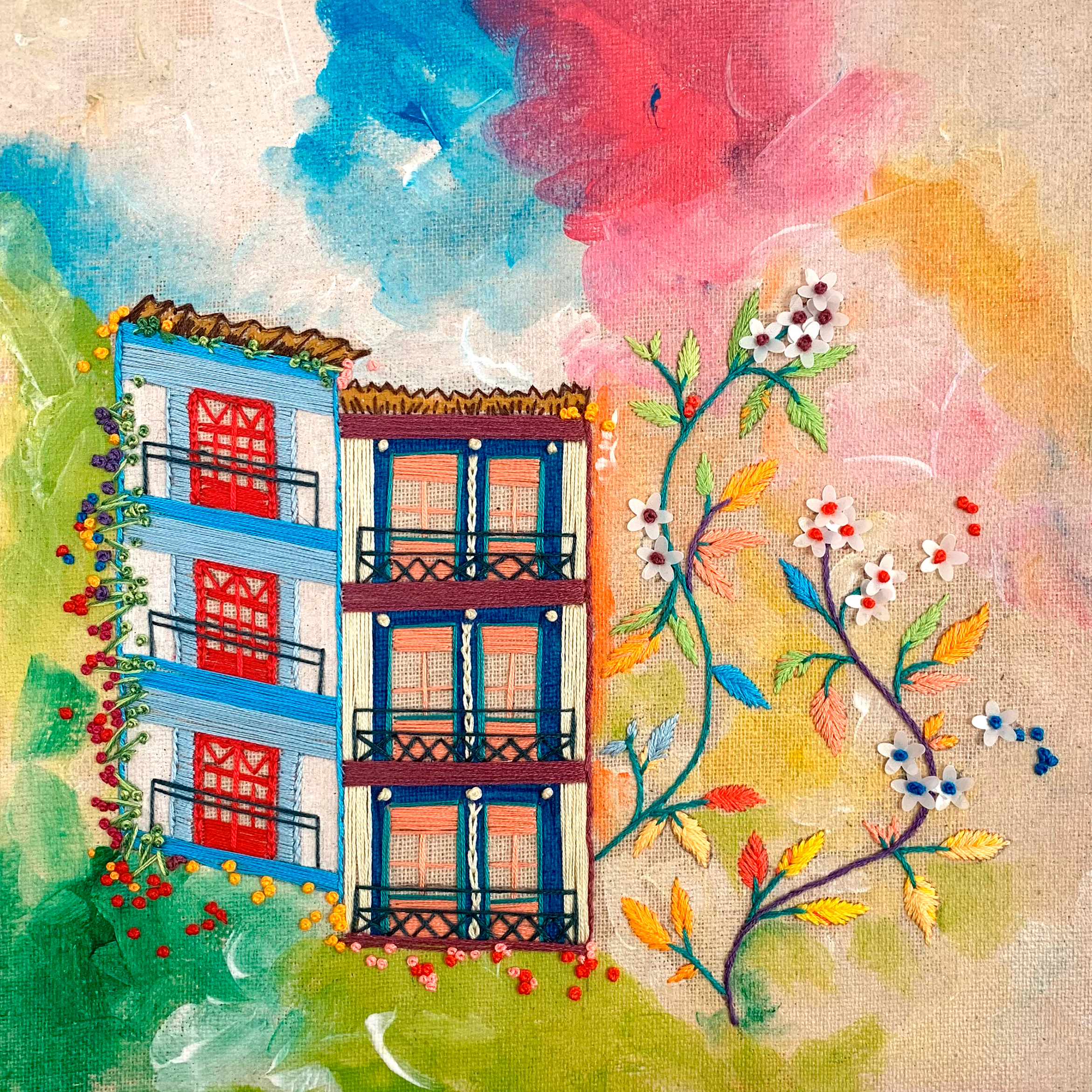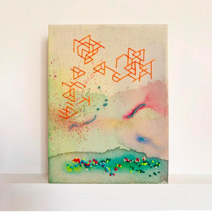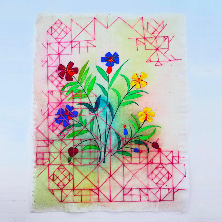 En nuestras piezas mezclamos técnicas y materiales, desde el uso del acrílico, la acuarela, mezclándolo con bordado y utilizando tela o papel.